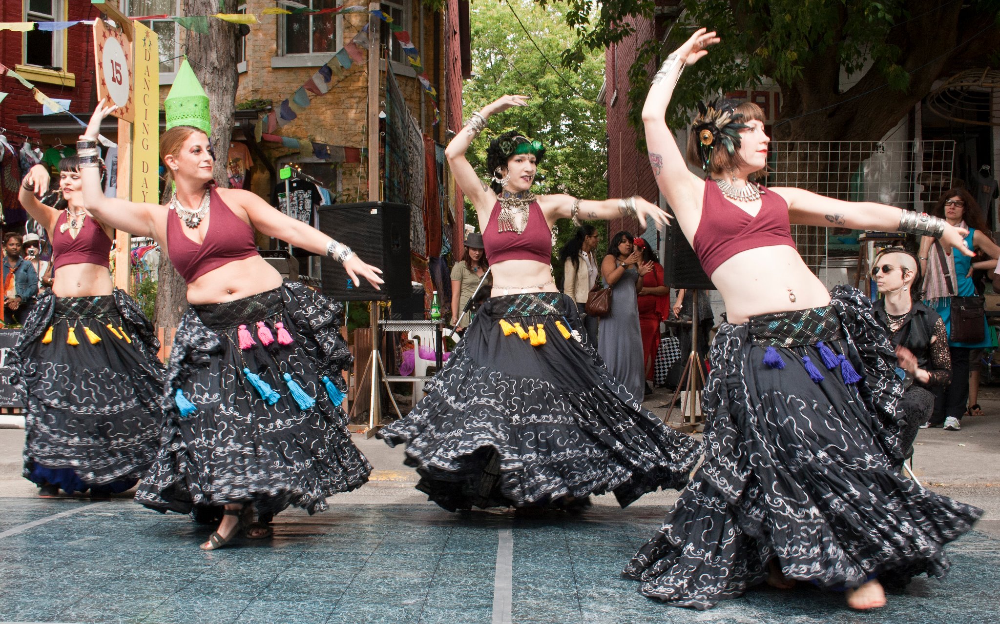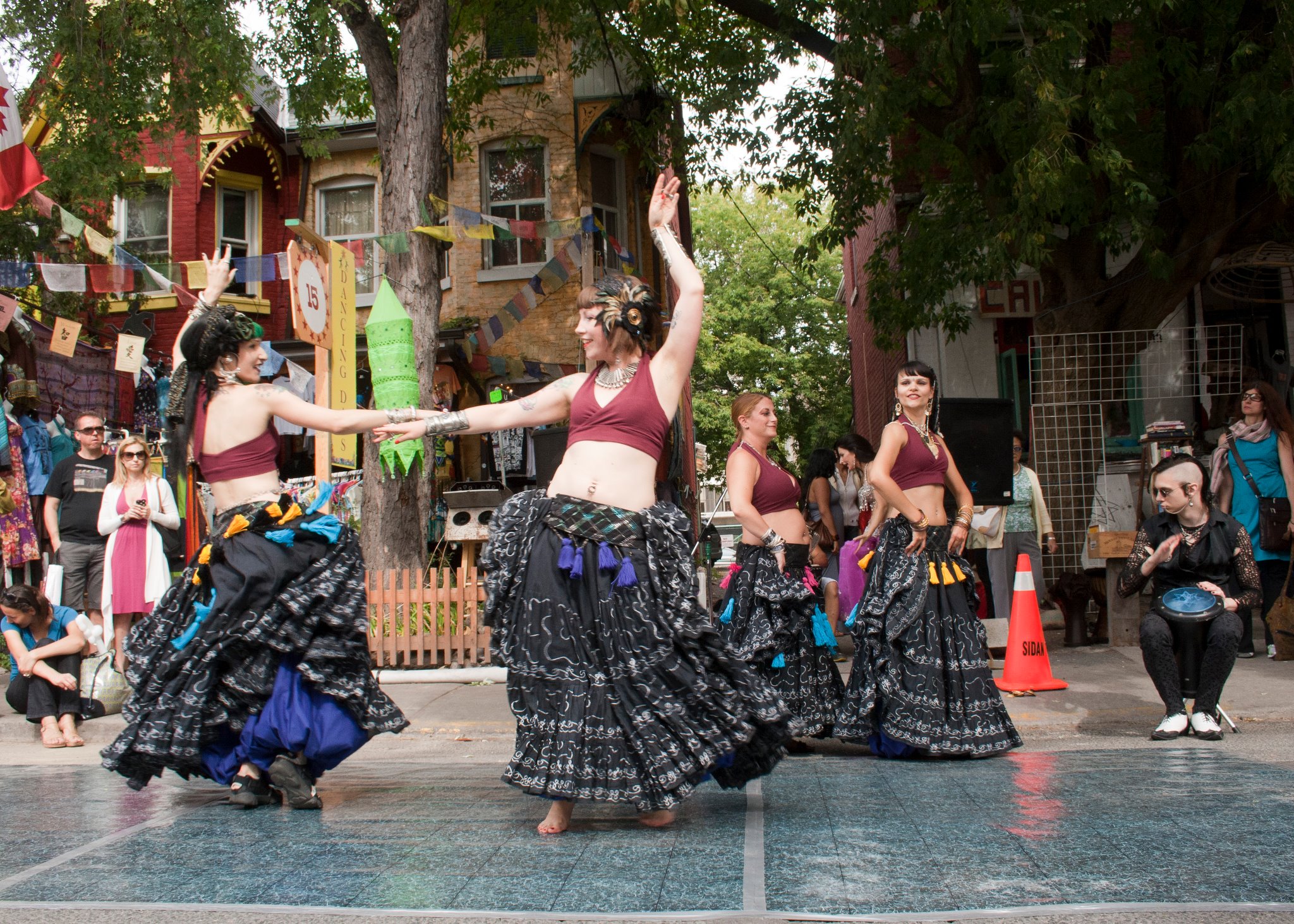 After a record breaking costume change, I danced my second ever performance with Serpentina North Ensemble, and we did two improv numbers which were super fun. Beautiful music, stunning costumes (I love these giant circle skirts!) and hey even some tips in the hat. Remember to show some monetary love to your local street artists and as Orkideh always says: especially the kind that folds! Thank you PS Kensington crowd for your love…